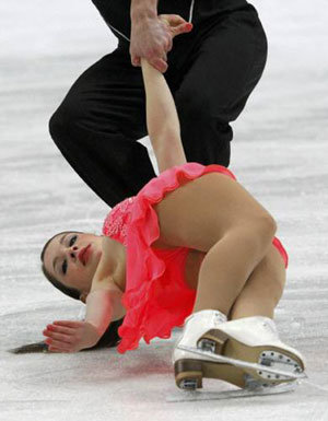 ドイツのカタリナ・ギーロク(下)、フロリアン・ユストが28日、スイス・ベルンで開かれたヨーロッパフィギュアスケート選手権ペアのフリーで、男性が女性の手をつかみ、男性が中心となり女性をその周りで回す「デススパイラル」を演じている。ペアでは、アリオナ・サフチェンコ、ロビン・ゾルコーヴィ(ドイツ)が優勝した。