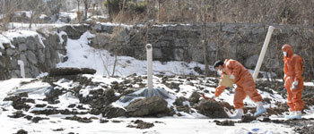 11日、仁川市江華郡仏恩面のある口蹄疫感染家畜の埋葬地で、郡庁職員たちが浸出水の漏洩や埋葬地の崩壊可能性について点検している。環境部は同日、全国にある32の埋葬地のうち16地域で2次環境汚染が起きる可能性があると明らかにした。