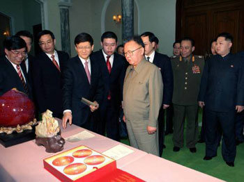 北朝鮮を訪問した中国国務委員の孟建柱公安部長(左側から4番目)が15日、金正日(キム・ジョンイル)総書記に中国から持ってきたプレゼントを見せている。金総書記の後ろ側に3男の金正恩(キム・ジョンウン)労働党中央軍事委副委員長が見える。