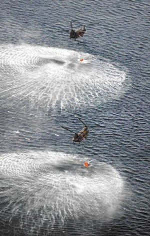 17일 일본 동북쪽 해상에서 자위대 헬기가 원전 냉각수로 사용할 바닷물을 담고 있다. 일본은 화재, 폭발로 심각한 상태에 직면한 후쿠시마 원전의 연료봉을 식히기 위해 이날 오전부터 냉각수 살포에 나섰다.