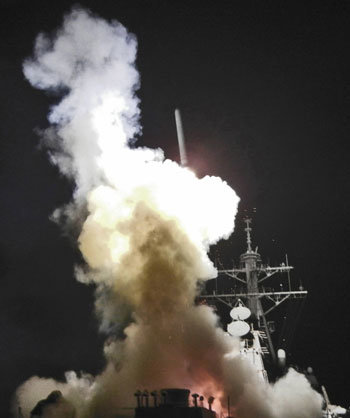 作戦名「オデッセイの夜明け」。米国、フランス、英国が主導する多国籍軍がリビア政府軍への初の軍事行動に乗り出した。写真は19日夜(当地時間)、地中海に展開されている米海軍の駆逐艦USSベリー号がリビアに向かってトマホークミサイルを発射する場面。同日発射したミサイル110発余りは、首都トリポリやミスラタなどに設置された防空施設20ヵ所以上を打撃したとされている。