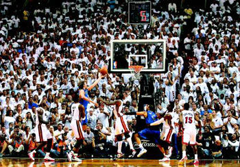 米プロバスケットボールのダラス・マーベリックの「ドイツ兵士」ダーク・ノビツキ(左から3番目)が3日、マイアミ・ヒートとのNBAファイナル第2戦で93−93の同点で終わりそうだった試合終了直前にゴール下シュートを放っている。終了3.6秒前に決まったゴールで、ダラスは95−93で勝ち、1勝1敗と振り出しに戻した。第1戦で指の怪我を負ったノビツキは、同日の試合で24得点と大活躍した。