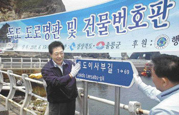 行政安全部と慶尙北道(キョンサンブクド)、鬱陵郡(ウルルングン)は15日、独島(トクド=日本名竹島)に、道路表示板や建物番号板を設置する行事を開いた。孟亨奎(メン・ヒョンギュ)行政案全部長官が、「独島異斯夫(イサブ)道」と書かれた道路表示板を取り付けている。同日の行事で、独島・東島(トンド)にある道は、「独島異斯夫道」、西島(ソド)にある道は、「独島安龍福(アンヨンボク)道」と道路名が付けられた。