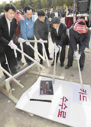 韓国ガソリンスタンド協会は20日、京畿道果川市(キョンギド・グァチョンシ)の政府果川庁舍の前で、カード手数料率を現在の1.5%から1%へ引き下げることを要求してデモを繰り広げた。デモに参加したガソリンスタンドの事業主らが、「カード手数料」と書かれたパネルを棒で叩き壊すパフォーマンスをしている。