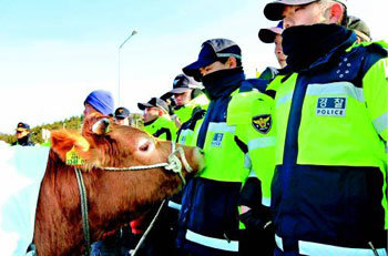牛の価格の暴落に抗議する全羅南道順天(チョルラナムド・スンチョン)地域の畜産農民約70人が5日、湖南(ホナム)高速道路の順天ナドルモク入口で、高速道路への進入を制止する警察と対峙している。農民は約50台のトラックに牛を乗せて上京闘争を試みたが、警察と激しいもみ合いの末、解散した。