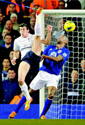 イングランド・プレミアリーグのトッテナムのガレス・ベイル(左)が12日、本拠地であるロンドンのホワイト・ハート・レーンで行われたリーグ戦で、エバートンのシルヴァン・ディスタンの密着マークを交わしてオーバーヘッドキックをしている。このシュートはゴールをはずれた。トッテナムは2−0で勝利し、リーグ2位のマンチェスター・ユナイテッドと勝ち点45で並んだ。トッテナムは得失点差で11ポイントの遅れをとって3位となったが、最近勢いをつけており、マンチェスター・ユナイテッドを緊張させている。