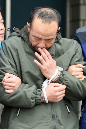 경기 수원시 20대 여성 피살사건의 범인 오원춘 씨가 10일 오전 고개를 숙인 채 수원중부경찰서를 나서 검찰로 송치되고 있다.