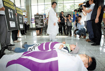 統合進歩党の姜基甲(カン・ギガブ)代表が25日、ソウル龍山区(ヨンサング)・白凡(ベクボム)記念館で開かれた党中央委会議に出席しようとしていたところ、姜基甲(イ・ソクギ)と金在姸(キム・ジェヨン)議員除名に反対する旧党権力派党員らのデモに遮られ、引き返している。姜代表は他のドアを通して会議に出席した。