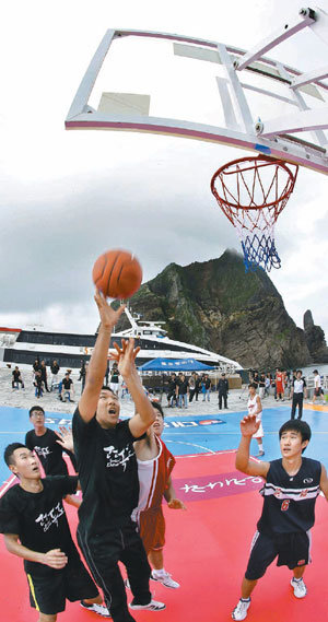 25日、慶尙北道鬱陵郡鬱陵邑(キョンサンブクド・ウルグン・ウルンウブ)の独島(トクド)船着場で開かれた「第2回、独島を愛する3対3のバスケットボール大会」で、高校選手の連合と独島警備隊員たちとが、バスケットボールの親善試合を行っている。同日の大会には、龍山(ヨンサン)高校や光新(クァンシン)情報産業高校、慶福(キョンボク)高校、東亜(トンア)高校の4つの高校が参加した。