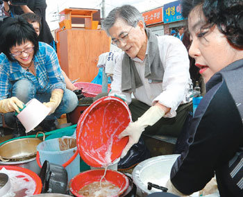 文在寅(ムン・ジェイン)民主統合党大統領選候補が18日、慶尚北道星州郡礼山里(キョンサンブクド・ソンジュグン・イェサンリ)の水害現場を訪問し、住民と共に鍋など家財道具を洗っている。