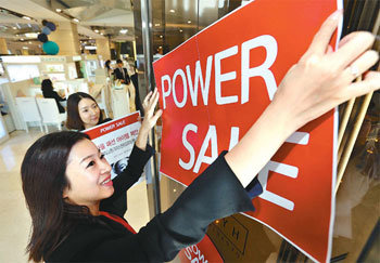 2日午前、現代(ヒョンデ)デパート狎鴎亭(アプクジョン)店で、職員が秋のセールを知らせる案内文を貼っている。ロッテ、新世界、現代デパートは、3日から21日まで一斉に秋のセールを実施する。