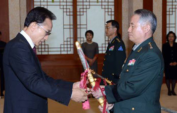 李明博(イ・ミョンバク)大統領は10日、大統領府で行われた軍将軍への進級・職責報告式で、クォン・ヒョクスン3軍司令官の三精刀に旗をつけている。