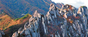 気温が下がるほど、雪岳山(ソルアクサン)の紅葉は絶頂に向かう。色とりどりの紅葉を背景に、白頭大幹パラグライディング横断チームがウルサンバウィ(蔚山岩)の上を軽く飛んでいる。このチームのように空で楽しむことはできないが、今週末、全国の山は紅葉狩りの観光客で賑わうと見られる。