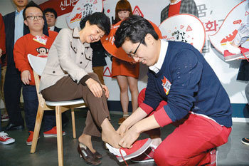 25日、ソウル汝矣島(ヨウィド)のセヌリ党の党本部で開かれた中央選挙対策委員会青年本部発足式の途中、選挙対策委員会青年部部長を務めるキム•サンミン議員が、党のシンボルである赤いスニーカーを朴槿恵(パク・クンヘ)候補に履かせている。