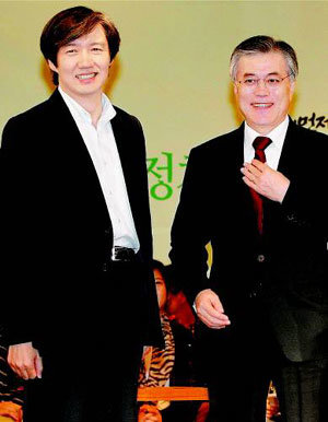 民主統合党の文在寅(ムン・ジェイン)大統領選候補が30日午後、ソウル永登浦区(ヨンドゥンポグ)のハジャセンターで行われた鉠国(チョ・グク)ソウル大学教授(左側)との対談に先立ってポーズを取っている。文候補はこの場で、「大統領4年重任制は国民の公論が集められていて、副大統領制も過去の歴史から見ても導入できる」と言って、執権時、改憲の意思を示した。