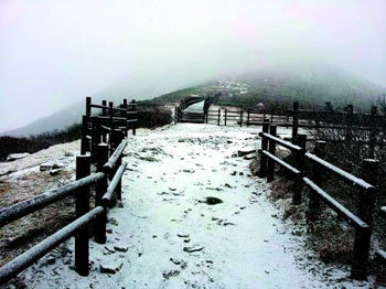 初雪が空とつながっている山道を白く覆った。30日午前、雪岳山(ソラクサン)大青峰(テチョンボン)と中青峰(チュンチョンボン)一帯に初雪が降った。昨年大青峰に降った初雪より10日早いものだ。気象庁によると、同日午前9時5分ごろから午後2時ごろまで約1.5センチの雪が中青峰待避所周辺に積もった。この一帯の最低気温は氷点下4.4度、雪が降る当時の気温は氷点下3度だった。同日、雪岩山の他、嶺東(ヨンドン、江原道の太白山脈の東側)山間地域も雪模様になった。