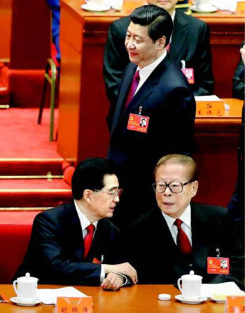 中国の次期指導部を選出する第18回全国代表大会(党大会)が8日、北京で幕を上げた。胡錦濤国家主席(左下)が、江沢民前国家主席と話をしているところを、次期国家主席に選出される習近平副主席(上)が通り過ぎている。江前主席は02年に主席を胡主席に委譲したが、上海幇の中心人物として次期習近平時代の人事で影響を及ぼすなど、影の実力者と見られている。党大会は14日まで7日間開かれる。