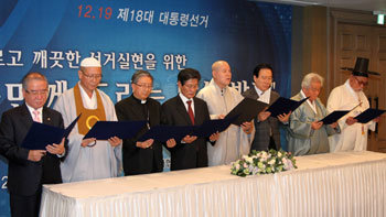 9日、ソウル中区(チュング)のプラザホテルで中央選挙管理委員会の主催で7の宗教団体指導者会議が開かれた。会議に先立って、大韓佛教曹渓(チョゲ)宗の慈乗(ジャスン)総務院長が「正しくてクリーンな選挙のための国民向けの訴え文」を朗読している。左からイ・ボムチャン天道教宗務院長、ナムグン・ソン円佛教教政院長、キム・ヒジュン韓国カトリック教主教会議大主教、金能煥(キム・ヌンファン)中央選挙管理委員長、慈乗総務院長、ホン・ジェチョル韓国キリスト教連合会代表会長、チェ・グンドク儒教成均館長、ハン・ヤンウォン韓国民族宗教協議会会長。