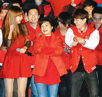 ジーンズ姿の与党セヌリ党の(バク・グンヘ)大統領選挙候補は18日、仁川延壽区(インチョン・ヨンスグ)の松島(ソンド)コンベンシアで開かれた「準備のできている女性大統領」ビジョンの宣言式で、若者たちと一丸となって、歌手・サイの「江南(カンナム)スタイル」に合わせて、馬乗りダンスを踊っている。