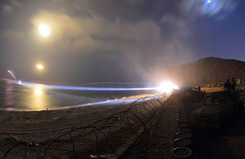 北朝鮮からの延坪島(ヨンピョンド)への砲撃攻撃2周年を4日後に控えた19日夜、延坪島海岸で海兵隊員らが、戦車や海岸砲、機関銃、バルカン砲などをいっせいに撃ち放ちながら、夜間射撃訓練を行っている。軍は23日、砲撃挑発2周年にあわせ、北朝鮮軍の西海(ソヘ)5島への奇襲攻撃を想定した局地挑発に備えての訓練を実施する予定だ。