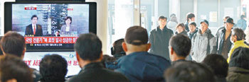 北朝鮮が長距離ロケット「銀河(ウンハ)3号」を打ち上げた12日午前、ソウル龍山区東子洞(ヨンサング・トンジャドン)ソウル駅の待合室で市民らが、テレビで緊急ニュースを見ている。発射寸前まで、ロケットの発射が延期となり、発射台が解体されるとばかり思っていた市民らは、ロケット発射のニュースを目にし、不安を隠せなかった。