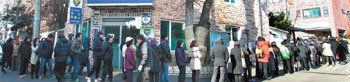 第18代大統領選挙日の19日午前、ソウル鍾路区玉仁洞の(チョンノク・オクインドン)の鍾路保健所に設けられた投票所の前で、有権者が投票のために長い列を作って順番を待っている。