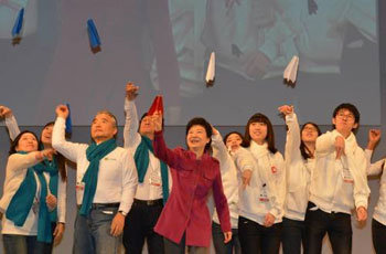 朴槿惠(パク・グンヘ)次期大統領が11日午前ソウル江南区三成洞(カンナムグ・サムソンドン)のコエクスで開かれた13グローバル就業大展開幕式で参加者らと紙飛行機を飛ばしている。