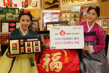 韓国人参公社が23日、ソウル中区(チュンク)の正官庄乙支路(ウルチロ)本店で、旧正月(2月10日)の贈答品として正官庄の紅参ギフトセットを展示した。人参公社は、24日から来月9日まで、正官庄の商品を15万ウォン分以上購入すれば1万ウォン割引するなど、様々なイベントを実施する。