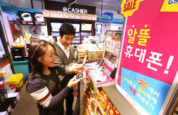 GS25、セブンイレブン、CUなどのコンビニエンスストアが最近、低価格の携帯電話機を販売している。中古を修理した携帯電話の価格は3万ウォン以下で、7万ウォンの新品のスマートフォンもある。25日、ソウル永登浦区文来洞(ヨンドゥンポク・ムンレドン)のGS25を訪れた客が携帯電話を選んでいる。