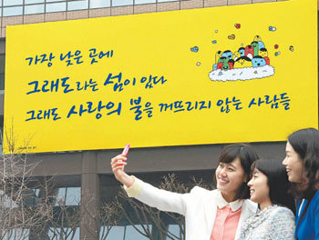 教保(キョボ)生命が春を迎え、光化門(クァンファムン)社屋などの外壁に掲げていた垂れ幕を、新たに取り替えた。教保生命は、季節ごとに新たな垂れ幕を作っているが、今回の春のシーズンの文章は、キム・スンヒ詩人の「それでも、という島がある」から持ち込んできた。ここには、「つらくて厳しい現実の中でも、希望を失わず、お互いに愛しあいましょう」というメッセージが盛り込まれている。垂れ幕のデザインは、多様な個性を持つ人たちが調和をなして、新しい希望を探していく姿を形象化した。教保生命側は、黄色を使って明るくてダイナミックな春の感じを生かしたと明らかにした。この垂れ幕は5月末まで、光化門の教保生命ビルや江南(カンナム)教保タワーなどに掲げられる。