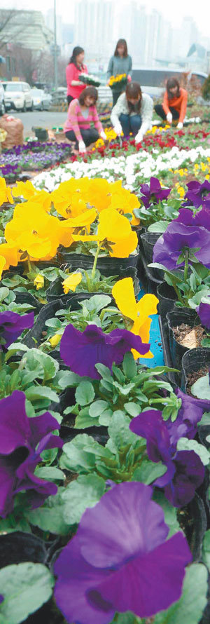 「万物が冬眠から目を覚ます」という啓蟄(5日)を控えた4日、ソウル城東区往十里(ソンドング・ワインシムニ)の交差点で、城東区役所の職員らが、セキチクやバイオレットなど、色とりどりの春の花を植えている。