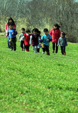 啓蟄(5日)が過ぎた6日、全羅南道康津郡馬良面(チョルラナムド・カンジングン・マヤンミョン)の麦畑。青色が鮮やかな初々しい麦の新芽が、温かい春の日差しに光っている。春のお出かけで一面が青くなっている麦畑を訪ねた子供たちが、走り回りながら楽しんでいる。