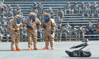 04年に撤退したが、韓国に再配置された米陸軍第23化学大隊が4日、京畿道議政府(キョンギド・ウィジョンブ)のキャンプ・スタンレーでBC兵器除毒(汚染処理)訓練を行っている。第23化学大隊は韓半島有事の際、北朝鮮の核や大量破壊兵器を探知して除毒するのが任務だ。北朝鮮の祖国平和統一委員会は3日、この部隊が再配置されたことについて、「極悪非道な犯罪的企図の発露だ」と非難した。