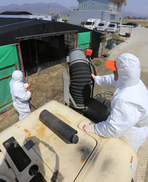 中国で新型鳥インフルエンザ(AI)による死亡者が増え、国内防疫にも赤信号がともっている。韓国の政府や自治体は、春に南から来る渡り鳥による国内への流入可能性に備え、特別防疫対策を実施している。9日午後、光州北区龍田洞(クァンジュ・ブクク・ヨンジョンドン)の養鶏農家周辺に、防疫当局の関係者らが消毒薬をまいている。