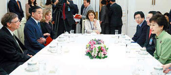 インテレクチュアル・ベンチャーズ(IV)の設立者、エドワード・ジョン氏(左側から2番目)と朴槿恵(パク・クンヘ)大統領と歓談するビル・ゲイツ理事長の左側に座っている。