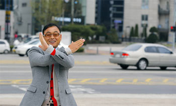 国民的マラソンランナー「ボンダリ」の李柱鳳(イ・ビョンジュ)孫基禎(ソン・ギジョン)記念財団の理事が、ソウル松波区芳荑洞(ソンパグ・バンイドン)のオリンピック公園前の道路で、「せっかちな反則運転はだめ」という意味で、両手でX印を作って見せている。