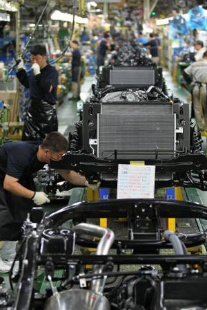 双竜(サンヨン)自動車で4年ぶりに昼夜2交代制が復活した13日、京畿道(キョンギド)の平澤(ピョンテク)工場3ラインの生産職労働者たちが忙しく自動車部品を組み立てている。同社側は同日、無給休職者454人を含め、全部で460人を現場に新たに配置したことを明らかにした。