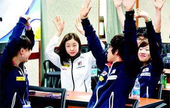 「フィギュア女王」金姸児(キム・ヨナ、左から2番目)と氷上の国家代表選手たちが14日、ソウル市城北区貞陵洞に位置する北漢(プカン)山探訪教育センター別館で行われた大韓氷上競技連盟の代表選手団ワークショップの途中、両手を上に伸ばしてストレッチをしている。連盟は同日、代表戦手段にソチ五輪に向けた心構えやドーピング、選手権益などについて説明会を行った。