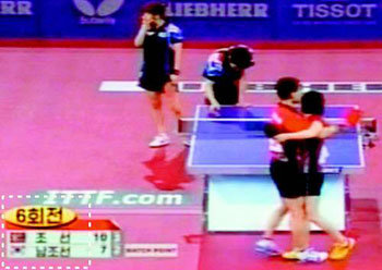 北朝鮮の朝鮮中央テレビが20日に放送した卓球世界選手権の決勝戦。朝鮮中央テレビが独自製作したスコアボードに太極旗のCGが鮮明だ(左の写真)。2010年12月、北朝鮮が録画中継した広州アジア大会の韓国と中国の女子バレーボール決勝戦(右の写真)では、中国国旗はそのままにして、太極旗にはモザイクをかけた。外国から収録映像をもらって放送する際は、画面の太極旗にモザイクかけていた過去とは大きく変わったもので注目が集まっている。