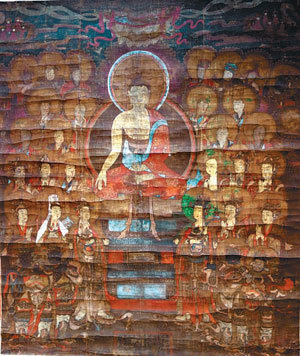 朝鮮・宣祖(第14代王)25年(1592年)に作られ、約420年ぶりに日本から韓国に戻ってきた「釋迦靈山會圖」。釈迦牟尼を中心に、真下の四天王から、その上の観世音菩薩や彌勒、文殊などの8大菩薩、迦葉や阿難損を始め、10大弟子を描いている。文明大教授からの提供。