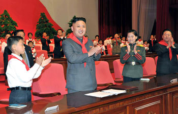 金正恩(キム・ジョンウン)北朝鮮労働党第1書記が6日、創立67周年を迎えた北朝鮮少年団の第7次大会が開かれた平壌(ピョンヤン)4・25文化会館で、少年団代表をはじめ参加者の拍手を受けながら微笑んでいる。朝鮮中央通信が7日配信した。