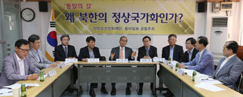 東亜(トンア)日報と韓半島先進化財団が共同主催する「統一への道、北朝鮮の正常国家化」セミナーが開かれた5日、ソウル市中区忠武路(チュング・チュンムロ)の同財団会議室で、セミナー参加者たちが、韓国主導の統一外交の強化策について討議している。