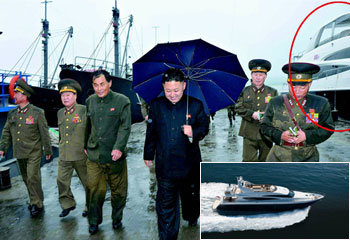先月28日、北朝鮮の金正恩(キム・ジョンウン)労働党第1書記が「8月25日水産事業所」を訪問した様子を伝える朝鮮中央通信の写真。右の横に高級ヨットの後ろ姿が見える。専門家らは、「甲板の手摺と屋根、レーダーの位置が、英国プリンセスヨット社の『プリンセス95MY』モデルと同じだ」と分析した。下の小さい写真は、プリンセス95MYの全体写真。