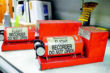米連邦交通安全委員会(NTSB)が事故航空機のアシアナ航空214便ボーイング777旅客機のフライトレコーダー(FDR=いわばブラックボックス)を、7日公開した。右側の操縦室の音声記録装置(CVR)は解読が容易だが、FDRは、1ヶ月以上の分析期間が必要だ。NTSBより提供。