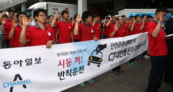 国内最大の物流会社、CK大韓通運が本紙とチャンネルAの共同キャンペーン、「エンジンを切れ(アイドリングストップ)!反則運転」に仲間入りする。8日午前、ソウル衿川区(クムチョング)の加山(カサン)宅配ターミナルで、貨物車運転員が安全運転宣誓を行っている。同日、CJ大韓通運は警察庁とも「善良運転マイレージ」協約を締結した。