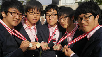 第44回国際物理オリンピアードに参加して総合1位を達成した科学の秀才達が金メダルを持ち上げている。キム・ドンフェ、イ・ジェハ、キム・ジェウォン、チョン・サンス、イ・チャンヒョン君(左側から)
