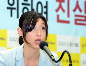 女子バレーボールの韓国代表、金軟景(キム・ヨンギョン)が15日、ソウル中区太平路(チュング・テピョンロ)の韓国プレスセンターで記者会見し、硬い表情で、大韓バレーボール協会などへの要求事項について発表している。