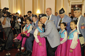25日、米ワシントンの米議会キャノンハウスビルで開かれた休戦協定60周年記念レセプションで、韓国戦争参戦勇士らが、公演を行ったリトルエンジェルズ合唱団の子供たちと一緒に記念撮影をしている。