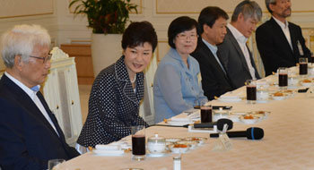 朴槿恵(パク・クンヘ)大統領が7日、大統領府で開かれた人文学や文化界の関係者らを招いての昼食会で、挨拶の言葉を述べている。左から柳宗鎬(ユ・ジョンホ)延世(ヨンセ)大学碩座教授、朴大統領、任敦姫(イム・ドンヒ)東国(トングク)大学碩座教授、権寧鏜(クォン・ヨンミン)檀国(タングク)大学碩座教授。