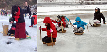 氷に穴を開けてワカサギを釣る穴釣り(左)や氷上ソリは、老若男女問わず楽しめる遊びの文化だ。首都圏に住む市民なら、江原道(カンウォンド)など遠くに行かなくても楽しめる名所がある。京畿道楊平郡丹月面(キョンギド・ヤンピョングン・タンウォルミョン)のスミ村に行けば、多彩な冬遊びの体験イベントがある。写真は昨年冬のスミ村の風景。